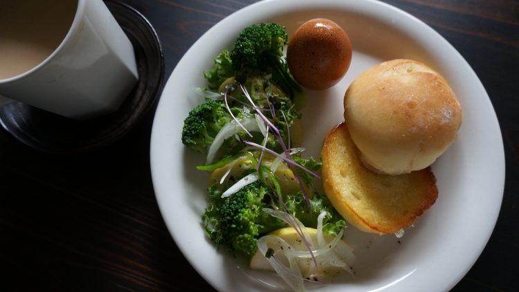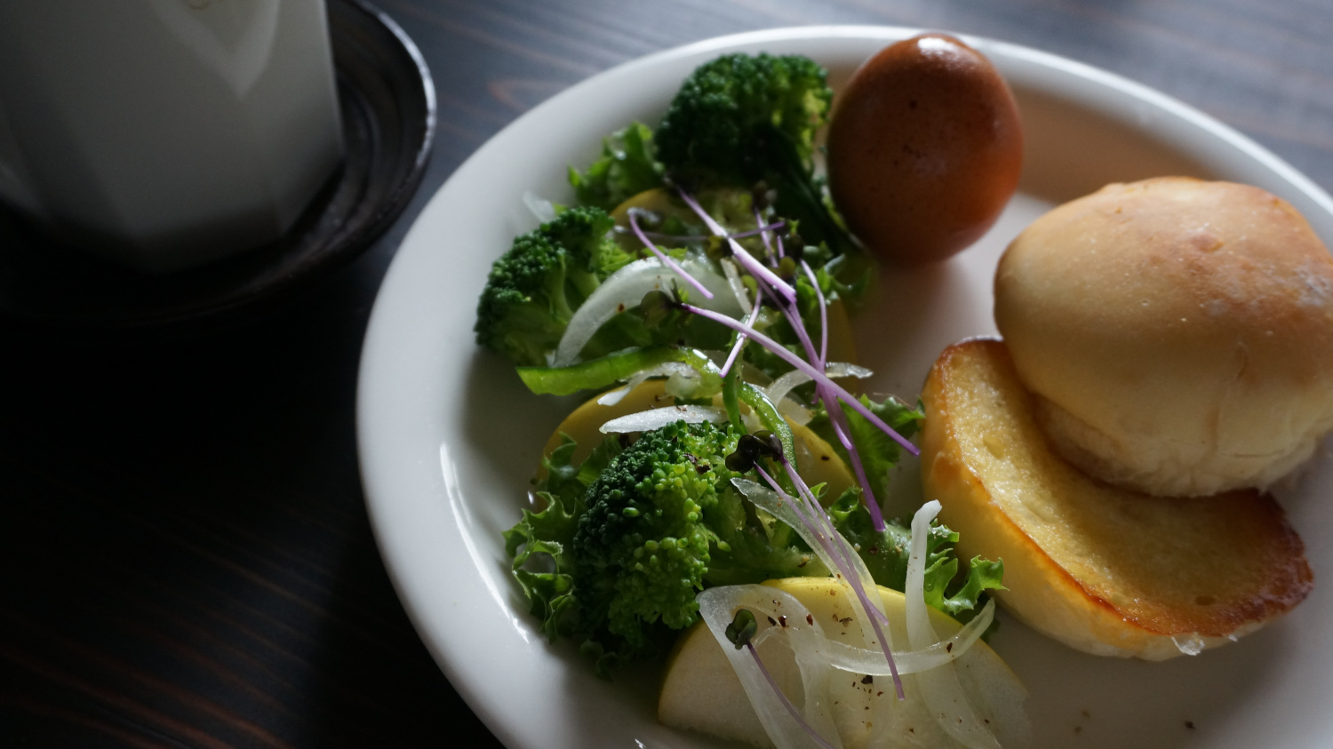 バターでカリッと焼いた米粉のロールパンが、思いのほか美味しかった。