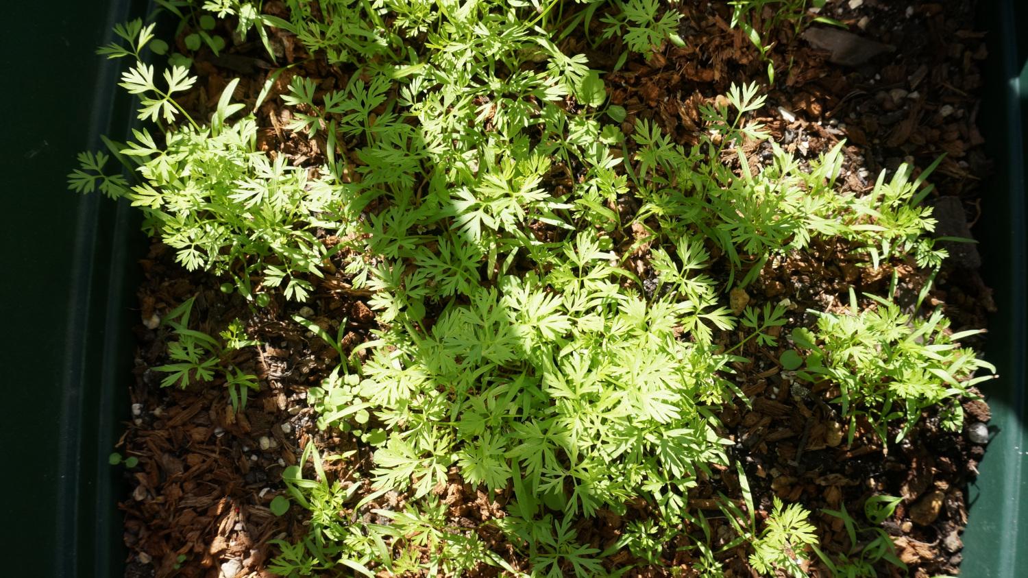 10月の満月の品種を蒔いたミニ人参の葉が、元気に育っている。