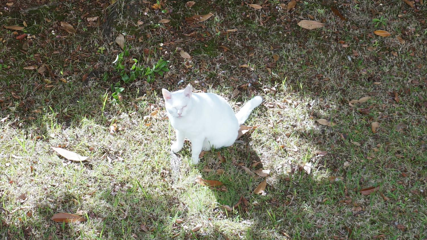 ふと、ベランダから前庭を見ると、TNRして9年になる白猫が日向ぼっこしていた。