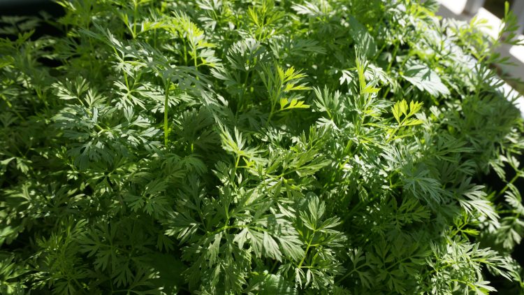 空いた鉢に種を蒔いたミニ人参が、葉っぱだけは元気がいい。