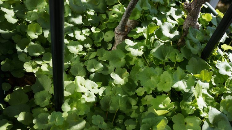 キウイのグランドカバーのカキドオシも、そろそろ鉢から飛び出しそう。