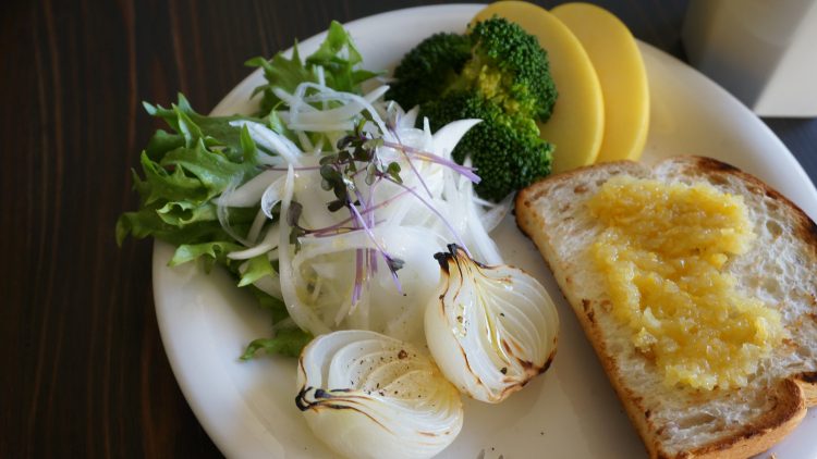 今朝は、スライス新玉ねぎと、グリルした小さめの新玉ねぎをメインにモーニング。