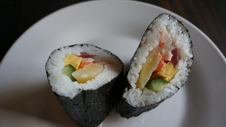マグロ、鮭、海老、数の子、イカ、玉子焼き、きゅうりの7種類で、数の子のコリコリした食感がいいね。