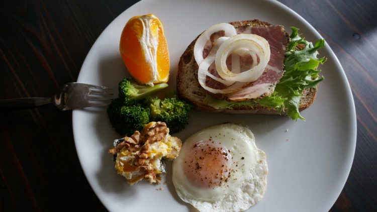 朝食は、パンとサラダと珈琲に果物、時々玉子が定番で、フライパンで両面を焼いたライ麦パンに、レタスとパストラミに新玉ねぎをのせたオープンサンド、ブロッコリー、カボチャと胡桃のサラダ、デコポン、めずらしく卵を焼いてモーニング。