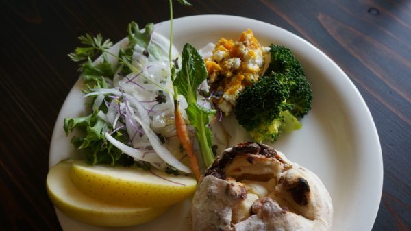 いつもはミックスする定番のリーフレタス、新玉ねぎとレッドスプラウト、カボチャのサラダ、ブロッコリー、小さな小松菜、林檎を別盛りにして、ベランダ栽培のミニキャロットも添えてモーニング。