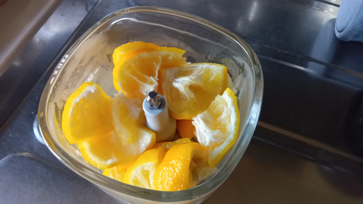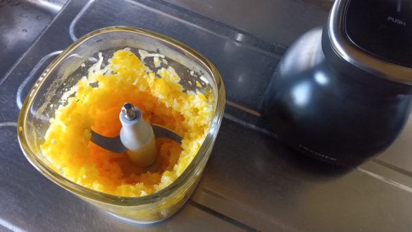 サンヨネの宅配で注文した2つの柚子が大き目だったので、一つずつ手付きのボウルで茹でてアク抜きし、半分にカットして種を取り除いたあと、チョッパーサイズにカット。