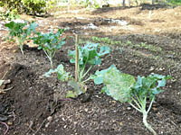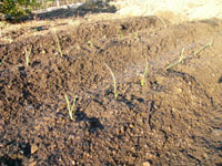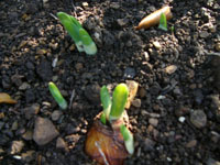 2004/11/23(火) 穏かな快晴 今日は”勤労感謝”の祝日。久々の畑仕事です。 ツタンカーメンの豆の芽が出て二週間がたち、勢いよく伸びた苗を、畑に移植しました。 本によりますと、寒害を避けるために藁を敷くそうですが、藁が手に入らないので枯れススキを代用。もちろん我家のバルコニーのも。 畑だけだと心配なので、25ポットのうち、6つはバルコニーで育てることにしました。どっちも、ちゃんと育ってくれるといいな。 入荷した玉ねぎの苗100本も、 三本の畝に植えましたが、腰痛がムクムク・・・。 ブロッコリーの葉が、虫に食われてレース模様。他の畑は大きな株になっているのに、肥料が足りないせいか日照(この時期2時間! 都会の安アパート並です。)が足りないのか、 植えてから三週間が経つというのに、まだまだひよっこです。今日は肥料を施してきましたが、日照の方は、冬至が過ぎるまでは、望めそうにありません。 水仙の球根が目を出していました。なんでも芽が出るということは、嬉しいもんです。