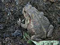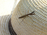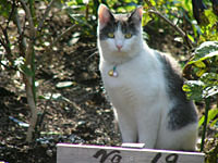 あまり使うことはないけれど、一株だけ植えたローズマリーの花が咲いていました。 麦藁帽子には、ブローチのようなカマキリ・・・動かなかったらそのままでもいいんだけどね。 鍬をふるっていて現れた塊がサツマイモの残りだと思っていたら、何とイボガエル!もうびっくりー! 畑を散歩道にしている近所の飼猫にご対面。今日は写真を撮らせてくれました。