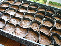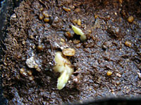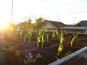 2004/11/13(土) 曇り KURIさんからいただいた、ツタンカーメンの豆を、水に2日間浸けてから、ポットに蒔きました。畑では目が行届かないのと、虫やカラスが心配だったからで、 ついでに菜花の種も蒔きましたが、同じように芽が出て、双葉になりました。 このやり方だと、確実に苗が育ちそうだし、間引きの必要もなさそうなので、今後の種蒔きはこれでいくことにしました。 |