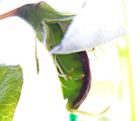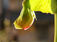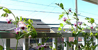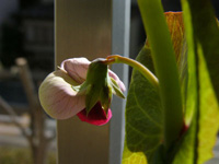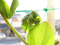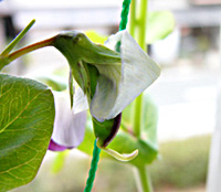 2005/2/24(木) 曇り後雨 いつのまにか、色褪せた花弁の間から、縁が紫色で真中が緑色のさやがのぞいていました。 紫色がツタンカーメン足らしめているのだけど、 花や葉を見ていると、エンドウマメと変らないような気がするのに、さやがどんどん紫色になっていくのが、ちょっと不思議。
