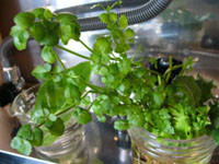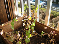 ブロッコリーの方は、双葉が出てそれらしくなったものの、水が腐ってしまい、途中で断念。育てるのは簡単だと思ったら、水の管理を工夫しないと、育たないことを学びました。 種はたっぷりあるので、再度挑戦。 2005/2/11(金) 晴れ ツタンカーメンの花は、二番成りから二房つづ付けるようになりました。そういえばエンドウマメも二つ一組だったのを思い出しました。 畑からコンテナに移したツタンカーメンの苗は、結局半分が復活。ぼつぼつ支柱を立ててネットを貼った方がいいのかも。 ブロッコリーの芽も、5日目でこんな感じ。お手軽にできるので、ガラスの器に追加して蒔きました。時差をつければ、いつでもスプラウトが常備できるというもの。