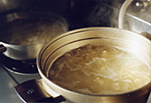 2005/2/6(日) 晴れ 寒波も遠ざかり、小春日和の陽気に、やっとツタンカーメンの花が開きました。 茎は手摺を越える高さに成長し、たくさんの蕾もつけて収穫の楽しみを約束してくれています。 いつのまにか、いろんな種類の種が集っていたので、今日はその中から「ブロッコリーの芽」というスプラウトの種を、 スフレの容器に撒きました。3〜4日で発芽し、7〜10日で収穫できるそうですから、短期のキッチンガーデンとして楽しめそうです。 キッチンガーデンといえば、セリの茎や大根、蕪のヘタをビンに入れておいたのが、どんどん葉が出てきました。 ちょっとグリーンを添えたい時に便利ですし、猫たちも気が向くとかじっているようです。 日当りのいいキッチンだから、ちいさな野菜の葉でいっぱいにするのも悪くはないと思い、スプラウト系をもっと作ってみようと思案中。 ![]() *************************************************************************************** 【手作りの合わせ味噌】・・・初めの一歩として、合わせ味噌に挑戦しました。 材料・・・有機大豆一升(1.4kg)、生米麹1kg、生麦麹1.2kg、天然塩540g(容器を買ったサイトで注文) ![]() ![]() 昨日から水に浸けておいた大豆を、二つの鍋で煮ながら、麹と塩を合わせて混ぜ易く(塩切り)する。 この塩切りというのは、前もってやっておいた方がいいようでした。 この分量だと、持っている大鍋でも3回に分けないと出来ないので(今日は中鍋も使って2回に)、今後は圧力鍋を検討中。 ![]() 煮あがった大豆をさまし、本来ならプロセッサーで潰すところを、厚手のビニール袋に入れて、足で潰しました。つぶつぶが残りますが、その食感も案外いいものです。 |