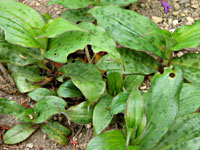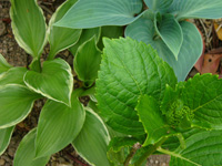 去年、畑に移植した鳴子百合・アジサイ・ギボウシ・ホトトギスが、元気よく葉を広げていた。