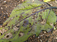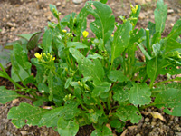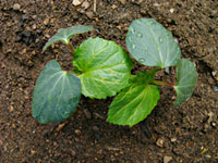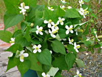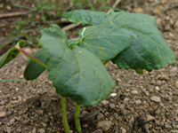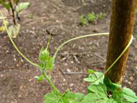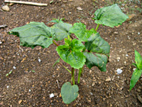2005/6/12(日) 晴時々曇り 午前中出そびれてしまったので、午後2時過ぎに家を出て、支柱に使う太目の竹を購入。 畑に着いてから、鋸で先端を斜めに切ったが、これがなかなか大変だった。 他の畑の人も、暑い時間帯は避けているのか、3時過ぎになると畑仕事にやって来た。 地主の会長さんから、ジャガイモをいただいた。やわらかい畝から掘り出したメークインは、とってもきれいな色と形をしていた。 ![]() トマトは、桃太郎もミニトマトも、いくつか身をつけている。 昔、トマトを植えたとき、ほとんどが黒くなって、失敗だったから、ちゃんと実ったら感動もの。 無花果も、よーく見ると、小豆くらいの実が、ポツンポツンと出来ていた。今年こそは実るかな。 ![]() これはゴーヤの花(真中)。苗を買ったときから虫に覆われていたので諦めていたけれど、ひ弱なりに、ちゃんと育っていた。 今日は、やっと支柱を立て、ネットを張った。 ![]() 作業を終えた後、林でドクダミを摘んだ。光が当らないから丈が長い分、華奢なドクダミだった。 2005/6/5(日) 快晴 オクラの苗が手に入り、遅ればせながら植えてきた。去年のよりも小さめだったけど、無事に育ってくれたらと思う。 ナスとゴーヤの苗は元気が無いけれど、トマトとキュウリ、ズッキーニは順調。サツマイモも、根付いたようだ。 ナスの葉が、虫に喰われてレース模様になっている。葉についてたカメムシが、益虫なのか害虫なのかが分らず、そのままにしておいた。