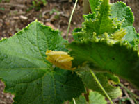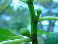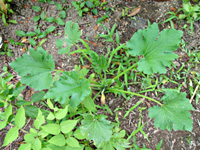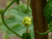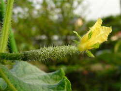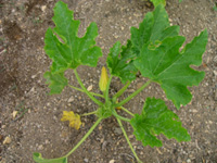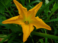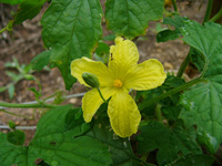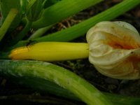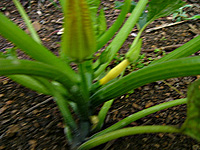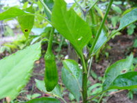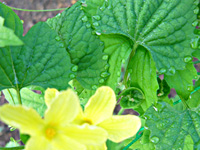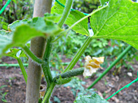 畝ではなく雑草の方に植えた、元気いっぱいのズッキーニは、緑色の実がつき始めている。 ヒトデのように、のびのびと咲いたズッキーニの花が、濃い緑の葉とのコントラストが、とっても美しい。 ゴーヤの花は、甘い香りがした。星の数ほど?に花が咲いているのに、ひとつも実が付いていないのは、受粉しにくいからなのだろうか・・・ そうそう、畑の雑草が、やっと充実してきた。そのうち野菜が埋もれてしまうかしら。 2005/6/19(日) 曇り時々小雨 実りの季節が、ゆっくりやってきた。ナスは生長が悪く、二番成りがやっと出来て、大きくなるのを待つばかり。 トマトの方の桃太郎は、いくつか実を付け、まだまだ大きくなりそう。ミニトマトも赤くなぁれと、首を長くしている。 シシトウ、キュウリ、そしてズッキーニが、やっと実を付けた。 ズッキーニは人の手で受粉が必要だと、昨日知ったばかり。どうりで今まで、花が落ちてしまったわけだ。 ゴーヤの花が咲き始め、オクラも順調。そして、無花果の実が増えてきたのが、なにより嬉しい。