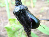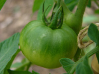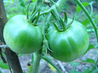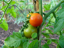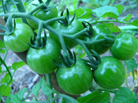 2005/6/224(土) 晴れ 朝5時半過ぎに家を出て、畑に向った。山は朝もやに包まれて、野菜も雑草も、たっぷりの露をたたえていた。 ミニトマトが、やっと色づき始め、桃太郎トマトも、たくさん実をつけている。 茄子は、相変わらずやせ細って頼り無いが、ちょっと早いけど来週では遅いかもと、貴重な1個を収穫。 シシトウも3個収穫して、朝の食卓に。