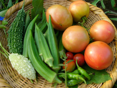 2種類のゴーヤも、少し小さいけど、待ちきれずに収穫。 今朝は、収穫した茄子、胡瓜、トマト、オクラでサラダを作った。